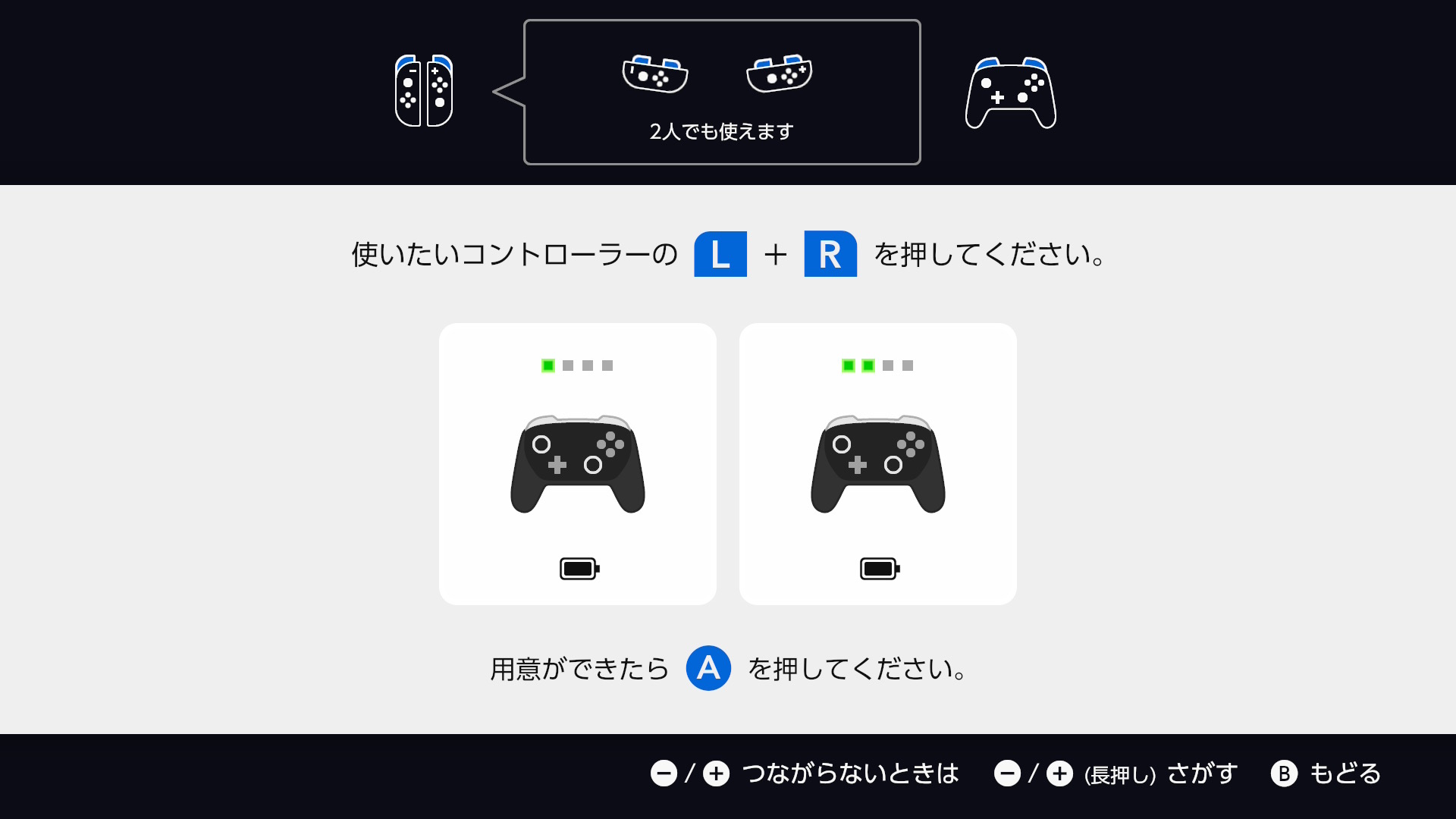 - コントローラーを2つ認識させて、「Aボタン」を押します。