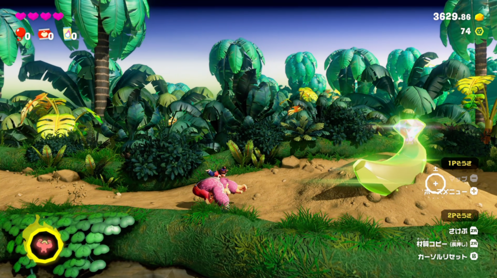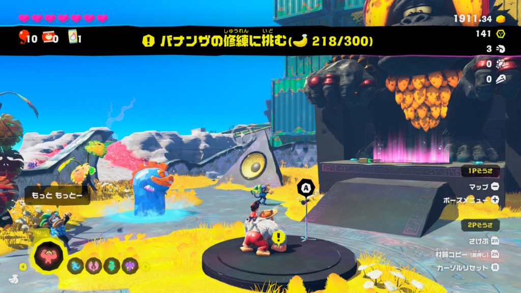 各探索エリアにはミニゲーム(風船集め、バトルやタイムアタックなど)が多数配置してあります。各ミニゲームに被りはなく、一つ一つ新鮮な気持ちで遊ぶ事ができました。中にはシリーズ過去作のような横スクロールタイプのミニステージもあり、シリーズファンにとっては嬉しいポイントだと感じました。加えて、各エリアに散らばった大きなバナナ「バナモンド」を集めて能力を強化したり、ドンキーコングや謎の少女の見た目を変更できる服やネクタイなどを集めるコレクション要素や、地形の破壊量によって実績が計測されていくようなコンテンツも用意されており、本編以外のやり込み要素が充実しています。