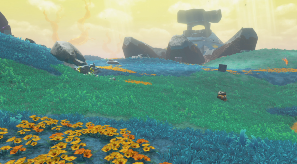 マップは100階層ごとに風景がガラッと変わる仕組みで、草原や雪原、火山、南国エリアなどがあります。草原エリアには広大で美しい草原が広がっており、初めて訪れた際には思わず見入ってしまいました。また雪原エリアには可愛い雰囲気の街にアイスクリーム屋さんがあったり、ほかのエリアではリアルな質感のフライドポテトやハンバーグを破壊しながら進むことができたりと、エリアごとの細かい世界観の構築がとても魅力的で、探索がとても楽しかったです。